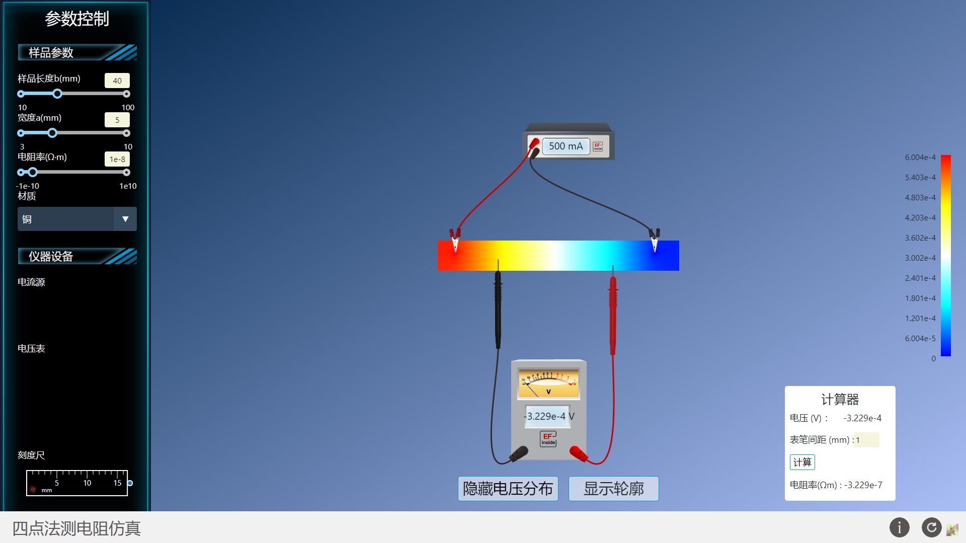 本仿真模拟不同样品用四点法测试电阻率,可调整电流源与电压表的探针,在样品上进行测量。可探究电流引线极接触电阻和引线电阻对测量的影响,以及数字电压表内阻对测量的影响。仿真计算电阻率是均匀的方形的,不同长度、不同宽度的材料中,电流源及电压表处于不同位置时测出的电压V,然后再计算样品电阻率,并与初设的标准电阻率进行核对。学生可拖动电流源,给样品通电流,可以查看样品通电后的电势分布。拖动电压表的表笔,对样品进行测量,改变电压表的内阻探究对测量结果的影响。